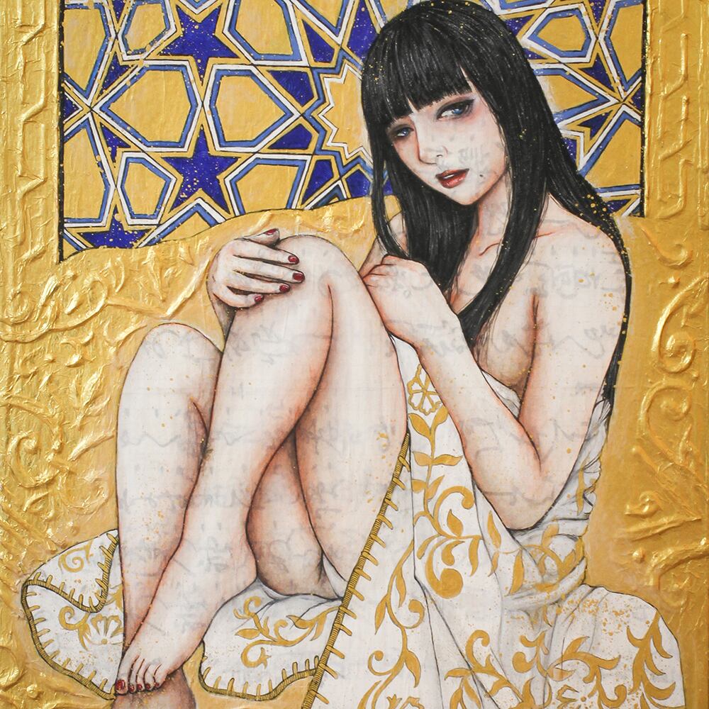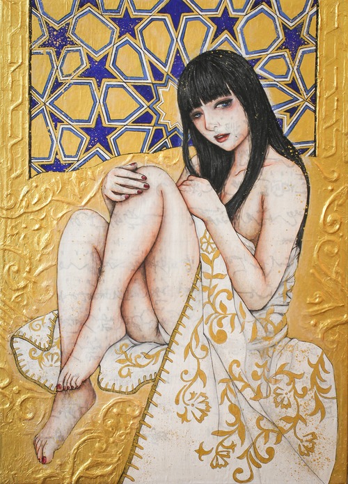 ●技法(technique):古紙・岩絵具・水干絵具・マニキュア・金箔(old paper・watercolor・manicure・goldleaf)