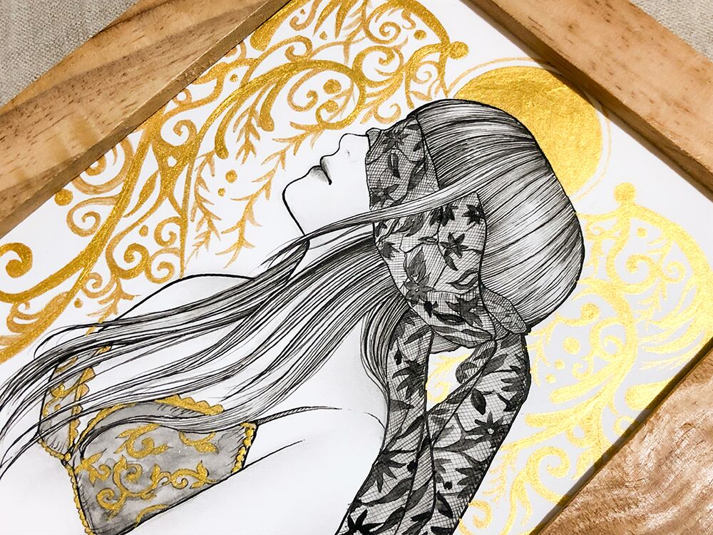 ●技法(technique):墨・ペン・金墨汁(japanese ink+watercolor+pen)
