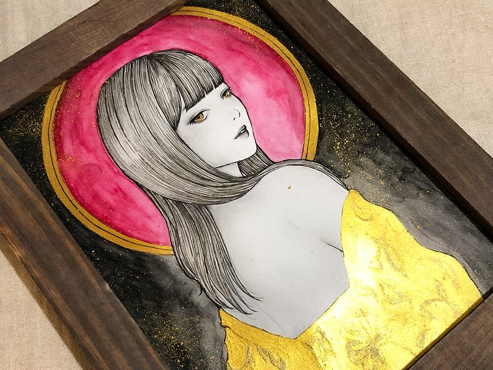 ●技法(technique):墨・顔彩・ペン・金墨汁(japanese ink+watercolor+pen)