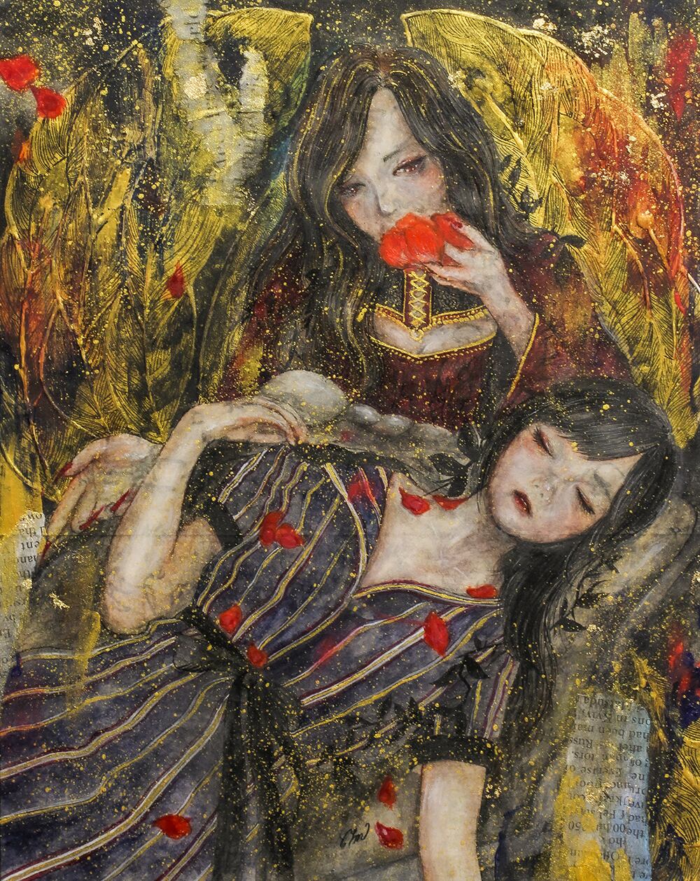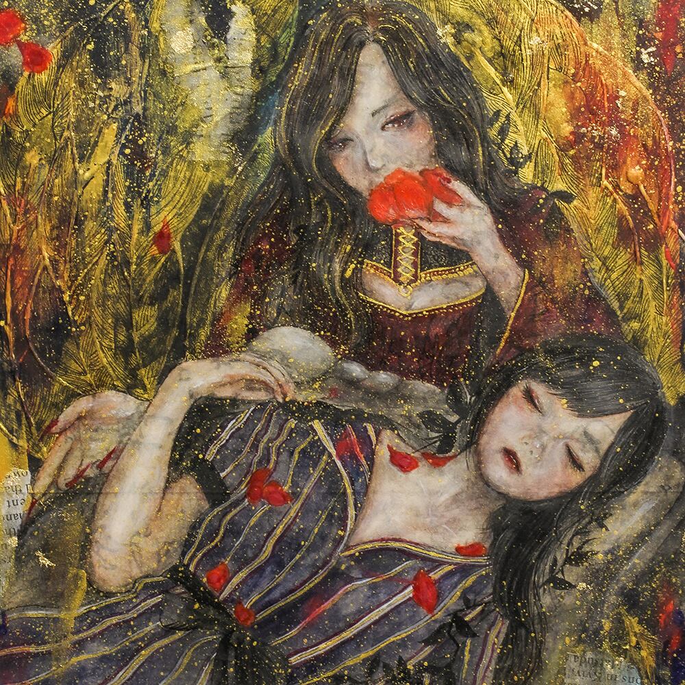 ●技法(technique):古紙・岩絵具・顔彩・金墨汁・洋箔(oid paper・mineral pigments・watercolor)