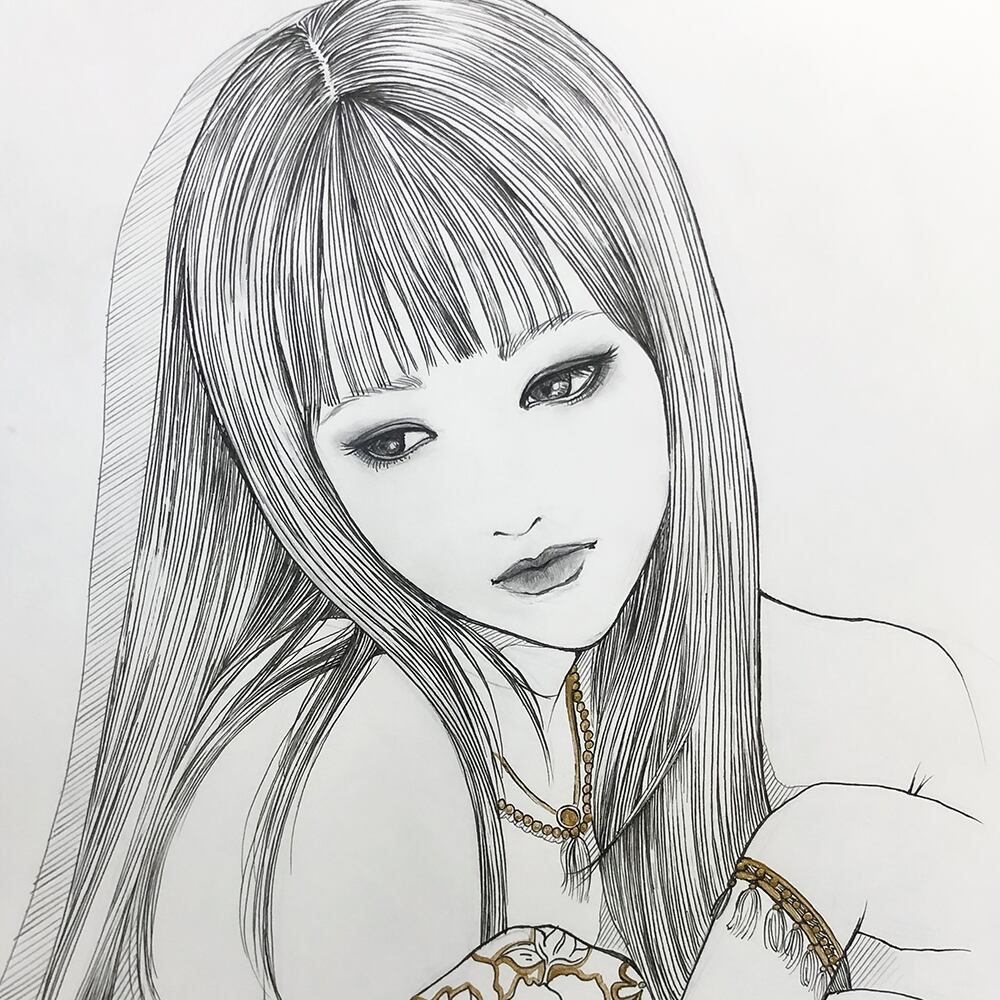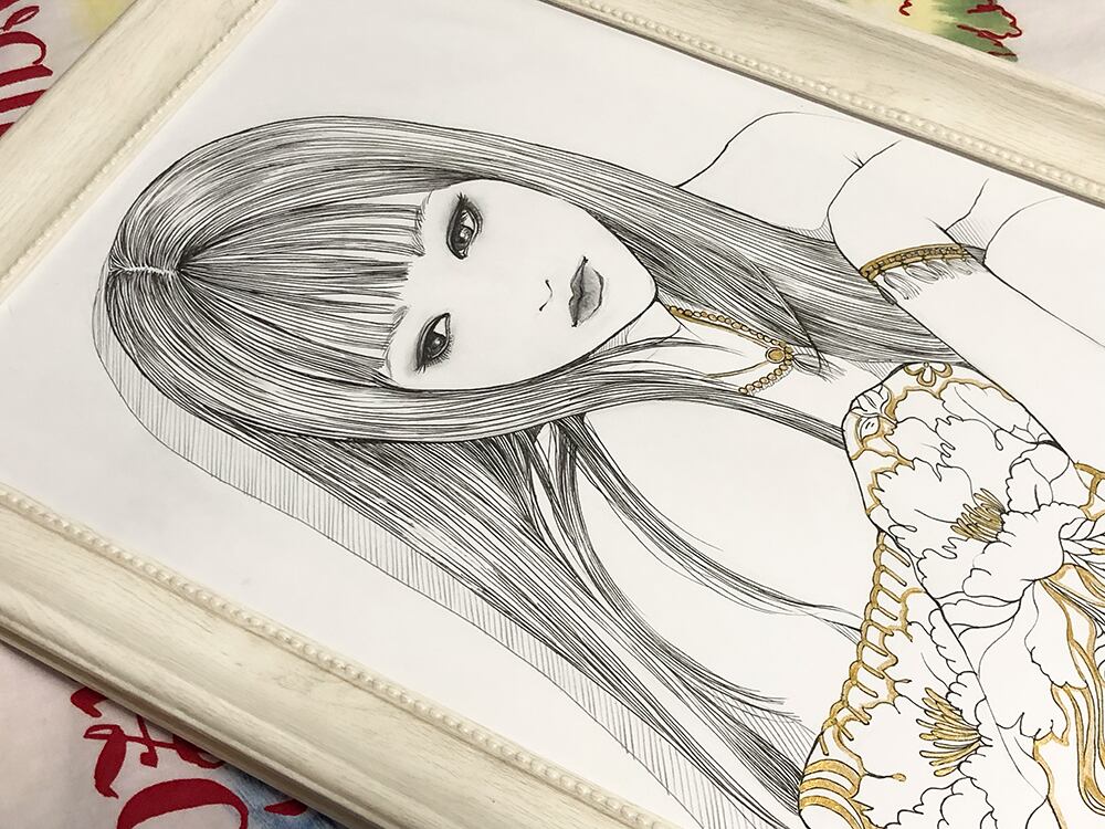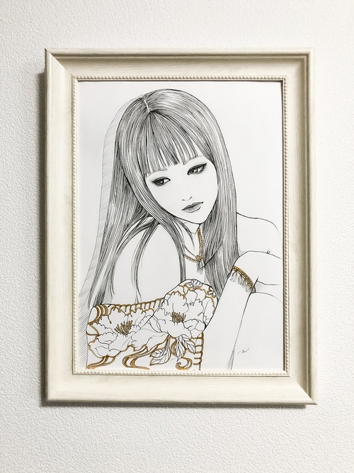 ●技法(technique):ペン・鉛筆・金墨汁(pen+pencil) ●サイズ(size): A4(210×297mm) ●作画年(year):2022年 ●備考(note):額有(with frame)