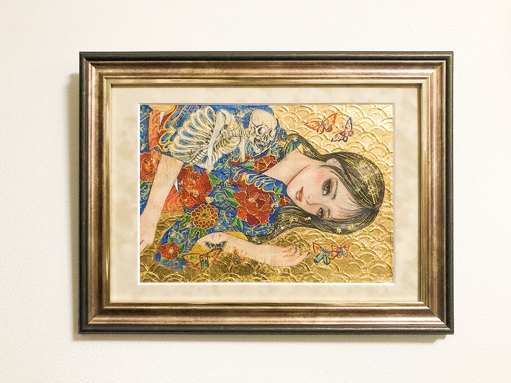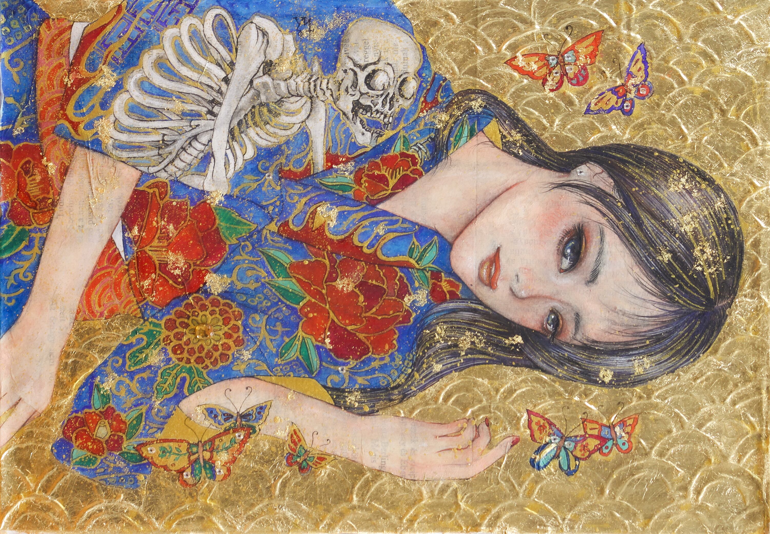●技法(technique):古紙・岩絵具・顔彩・洋箔・金墨汁・ラインストーン(old paper・watercolor・mineral pigment・Sumi・gold leaf・Limestone)
