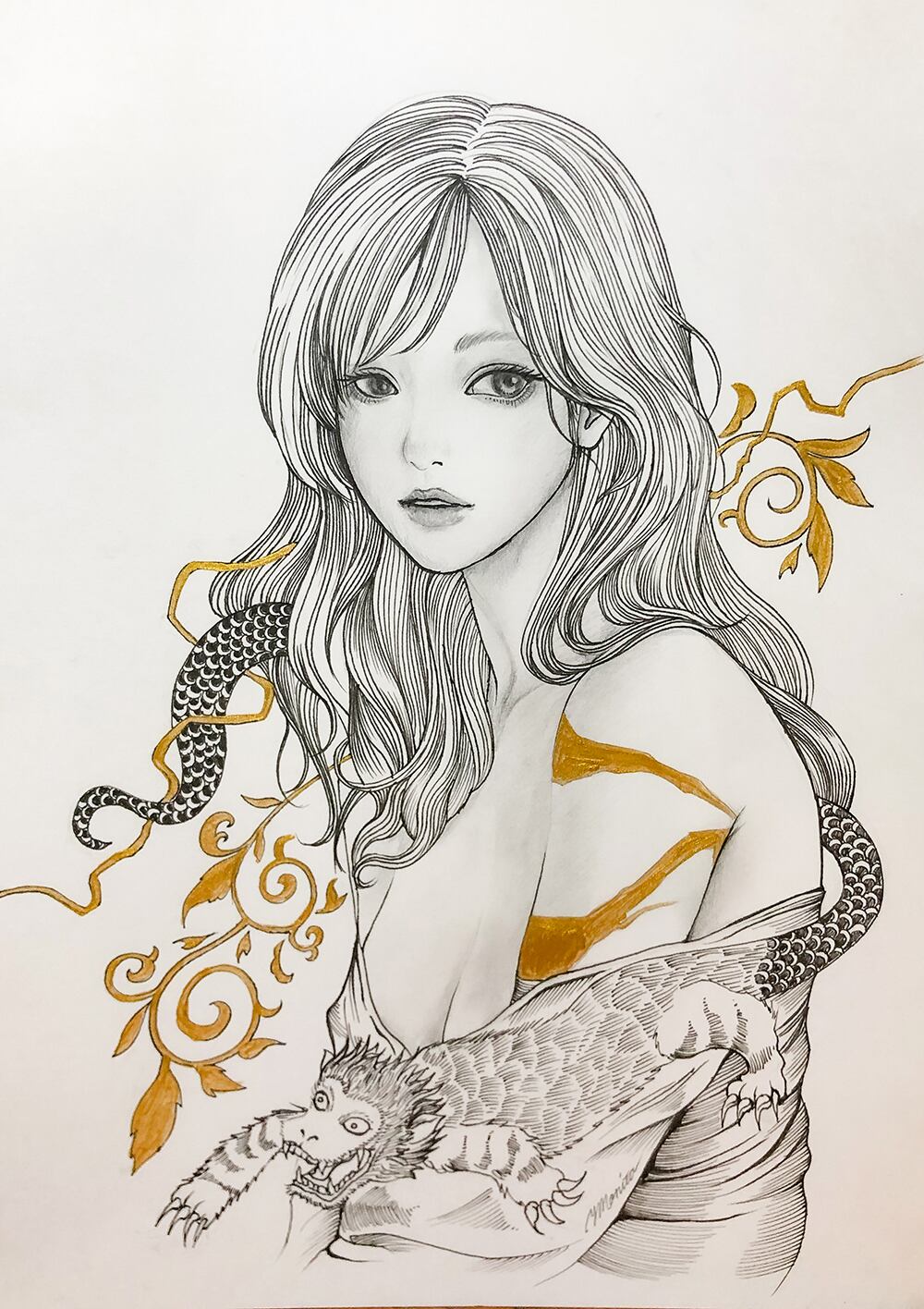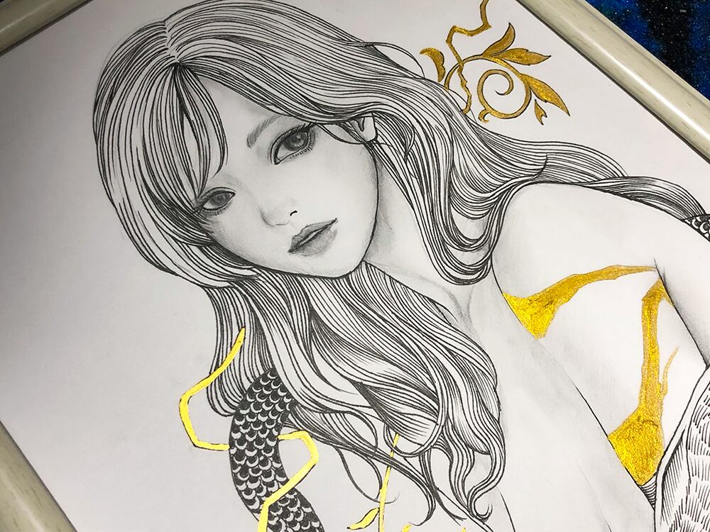 ●技法(technique):ペン・鉛筆・金墨汁(pen+pencil) ●サイズ(size): A4(210×297mm) ●作画年(year):2023年 ●備考(note):額有(with frame)